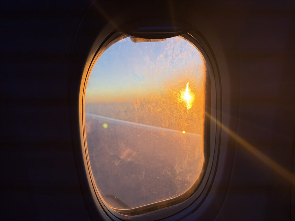 飛行機の窓から見えた朝日が、